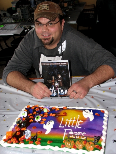 To celebrate the birthday of LITTLE FEARS: NIGHTMARE EDITION, there were two really awesome cakes on hand. This first picture is of LITTLE FEARS game designer Jason L Blair, who posed above a Cthulhu cake created by Mad City Cakes. (Yes, the cake really did bleed when we cut it and yes, those are hand-crafted stones, books and tentacles on the cake.)